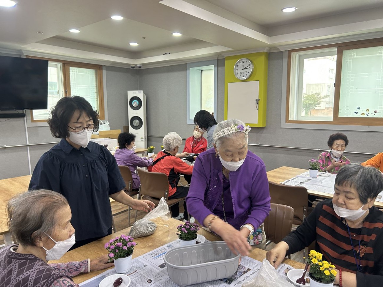 2025.10.14 원예교실 프로그램 최고관리자 0 604 2025.10.14 15:11 오늘 주간보호에서는 원예교실 프로그램을 진행했습니다.알록달록한 소국화를 큰 화분에 옮겨심고, 돌과 흙으로 채워준 뒤 예쁜 푯말을 꽂아 완성했어요. ❛ ᴗ ❛.어르신들께서는 향긋한 국화 향기를 맡으며 “가을이 왔네~” 하시며 미소를 지으셨어요.손끝으로 흙을 만지며 마음도 차분해지는 힐링의 시간이었답니다^^