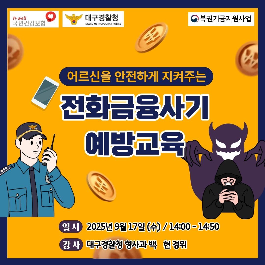 전화금융사기 예방교육 최고관리자 0 157 10.16 13:18 어르신들과 함께한 전화금융범죄 예방교육“내가 안전하게 지킬 수 있는 방법은 무엇일까?”어느 맑은 오후, 국민건강보험공단과 대구경찰청이 함께 마련한 특별한 시간을 가졌어요!이번 프로그램은 바로, 어르신들을 위한 전화금융범죄 예방교육!다양한 보이스피싱 사기 유형을 알아보고, 현명하게 대처하는 방법을 배워보는 뜻깊은 자리였답니다.