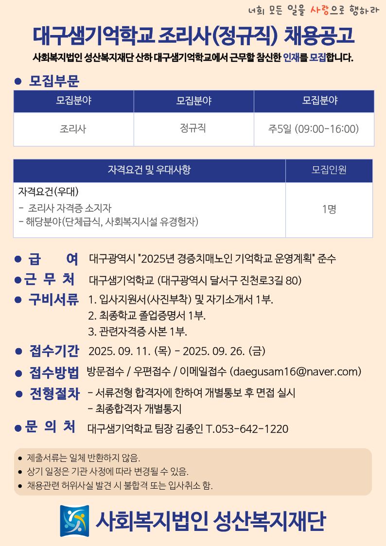 [사회복지법인 성산복지재단] 대구샘기억학교 조리사(정규직) 채용공고