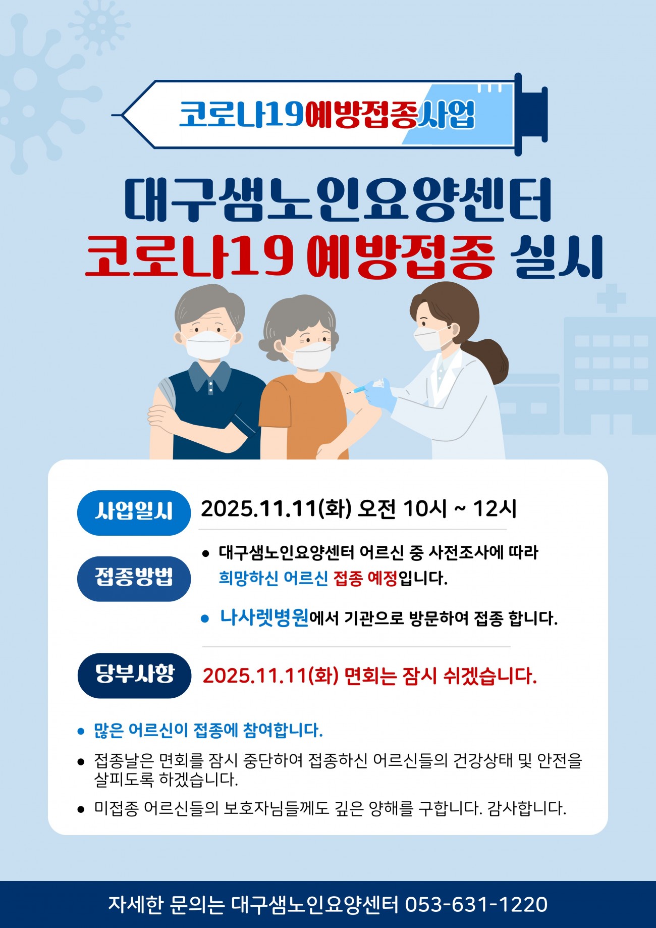 어르신 코로나19 예방접종 안내 최고관리자 0 137 11.07 16:26 <사전조사를 통해 예방접종을 희망하신 어르신 코로나19 예방접종 실시>■접종 일시 : 2025년 11월 11일(화)■접종 기관 : 나사렛병원
