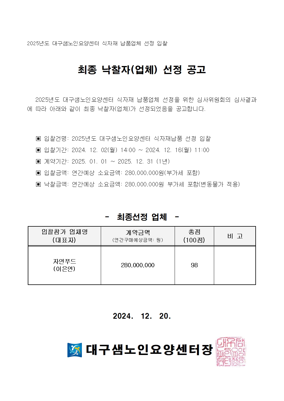 2025년도 대구샘노인요양센터 식자재 납품업체 입찰 건 최종낙찰업체 선정 공고 대구샘노인요양센터 0 917 2024.12.20 12:36 2025년도 대구샘노인요양센터 식자재 납품 업체 선정 입찰 건 최종낙찰업체 선정 공고