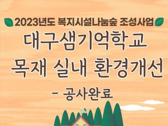 지난 블로그에서 대구샘기억학교는 2023년도 복지시설나눔숲 조성사업에 선정되어 프로그램실, 생활실, 물리치료실을 리모델링을 진행과정을 보여드렸죠?
