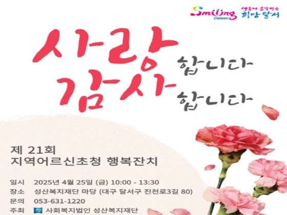 제 21회 지역어르신 초청 행복잔치 성산홍보실 0 553 05.03 12:45 제 21회 지역어르신 초청 행복잔치일 시 : 2025년 4월 25일 (금) 10:00 - 13:30장 소 : 성산복지재단 마당주 최 : 사회복지법인 성산복지재단(대구성로원, 대구샘노인요양센터, 대구샘재가노인복지센터, 대구샘기억학교)