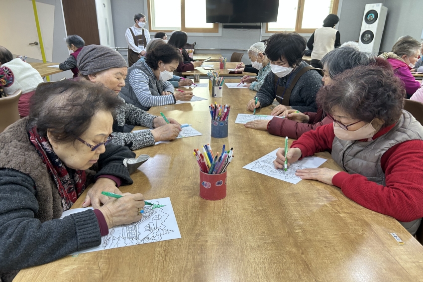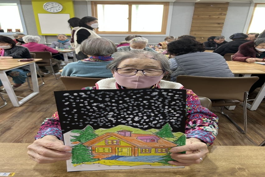 2026.01.23 창작활동교실 프로그램 최고관리자 0 236 01.23 15:50 오늘 창작활동교실에서는 어르신들과 함께 하얀 눈이 덮인 겨울 산을 그려보았습니다.정성껏 도안을 색칠한 뒤, 면봉에 하얀 물감을 찍어 밤하늘에 내리는 눈을 표현해 보았는데요~간단한 재료지만 어르신들의 손길이 더해지니 세상에 하나뿐인 아름다운 겨울 풍경이 완성되었습니다^^추운 날씨도 잊게 할 만큼 마음 따뜻하고 멋진 시간이었답니다.