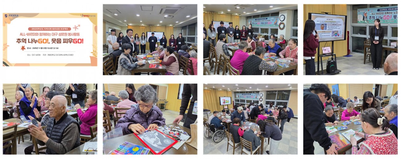 All-바르미와 함께하는 "추억 나누GO !, 웃음 피우GO !" 최고관리자 0 330 2025.11.25 00:48 계명대학교 All-바르미와 함께하는 "추억 나누GO !, 웃음 피우GO !"지난 11월 22일 토요일 계명대학교 자원봉사단 'All-바르미'와 함께하는 지역사회 동반성장프로젝트가 오늘 오후 성로원 식당에서 진행되었습니다. 학생들의 활기넘치는 프로그램 진행으로 어르신들께서도 평소보다 더 즐겁고 활기찬 모습으로 참여하셨으며 모두 만족스러워하시며 프로그램이 잘 마무리되었습니다.