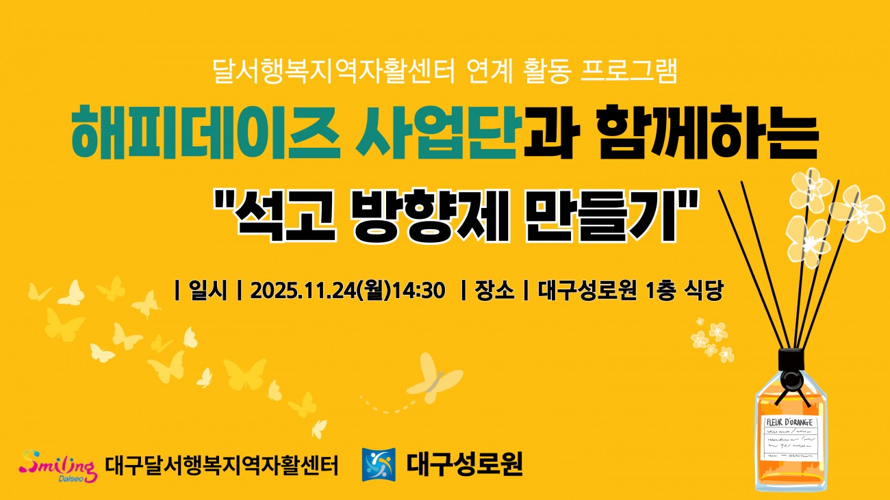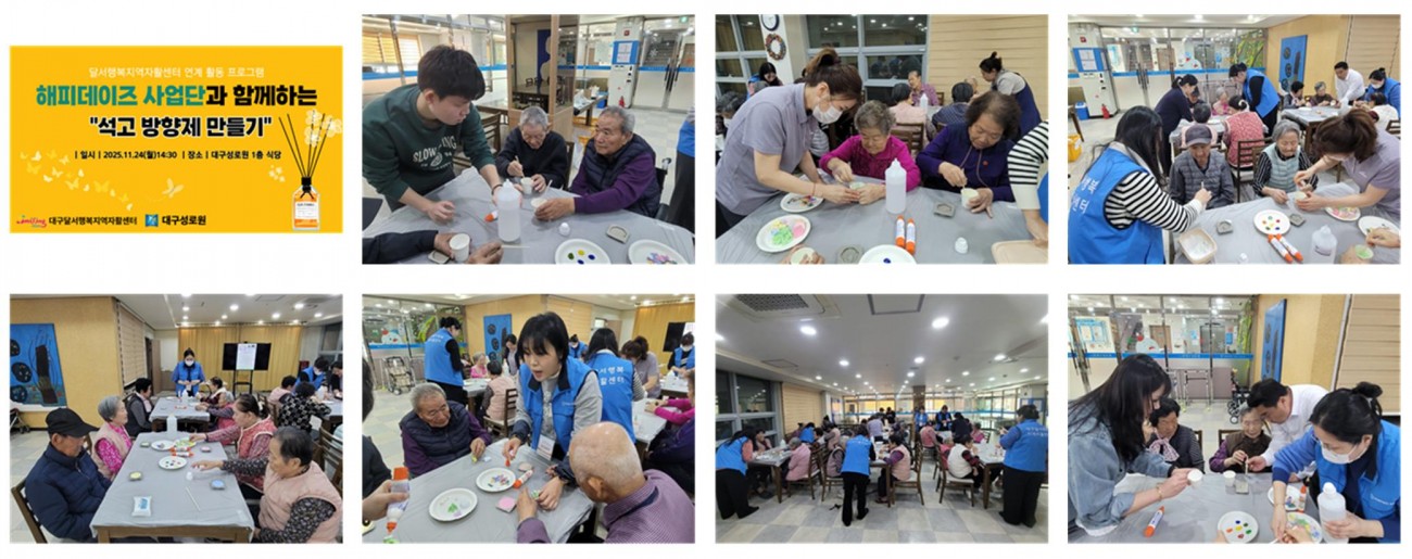 2025 해피데이즈 사업단 프로그램(1차) 최고관리자 0 325 2025.11.25 01:04 해피데이즈 사업단 "석고 방향제 만들기"지난 11월 24일 월요일 달서행복지역자활센터 연계 프로그램 1차 " 해피데이즈 사업단" - 석고 방향제 만들기가 진행되었습니다.해피데이즈 사업단 직원들이 성로원을 방문하여 함께석고 방향제를 만들어 보았습니다. 만드는 과정도 쉽고 만들고 보니 이쁘기도 해서 어르신들이매우 만족 하셨었습니다.