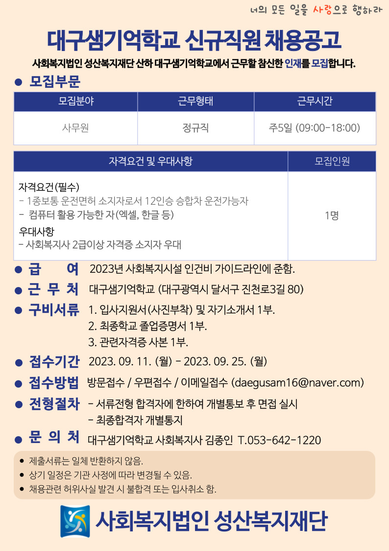 [사회복지법인 성산복지재단] 대구샘기억학교 사무원 채용공고