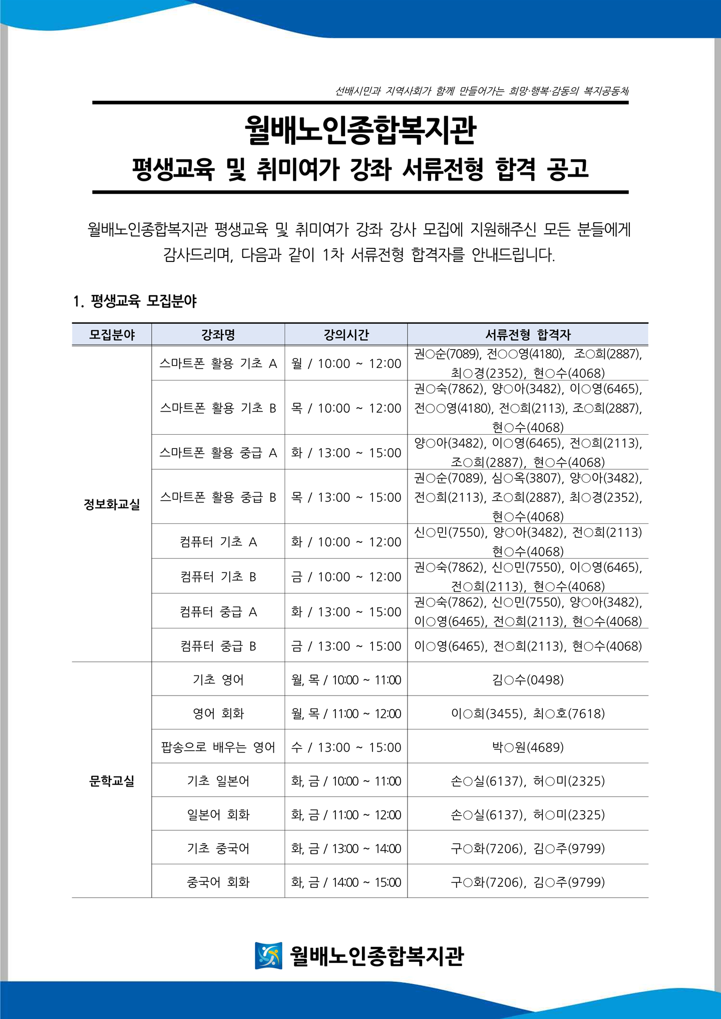 2025년 월배노인종합복지관 평생교육 및 취미여가 강좌 강사 최종 합격자 공고
