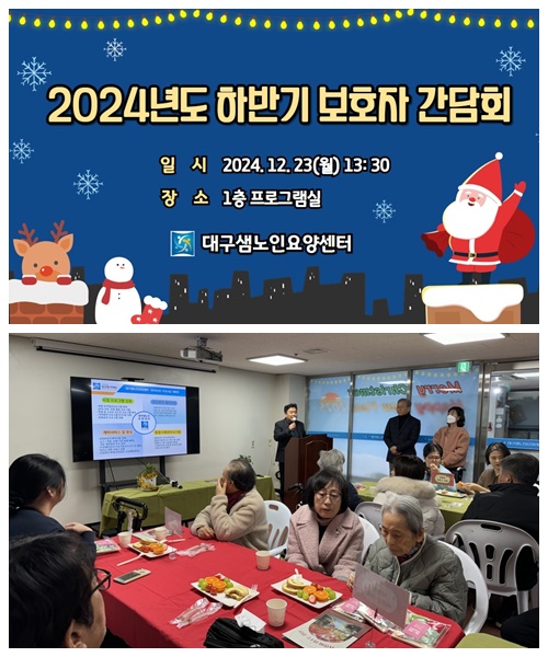 2024년 하반기 성산복지재단 산하 기관 보호자 및 어르신 간담회 성산홍보실 0 9146 2025.01.04 14:41 2024년 하반기 성산복지재단 산하 기관 보호자 및 어르신 간담회주최: 대구샘노인요양센터, 대구성로원, 대구샘재가노인복지센터, 대구샘기억학교
