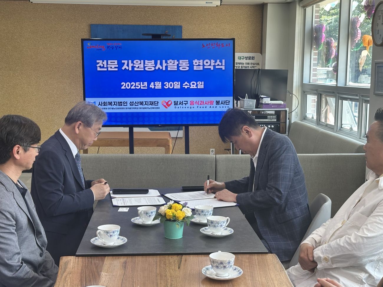 달서구음식사랑봉사단과 함께 전문 자원봉사활동 협약을 체결하였습니다.